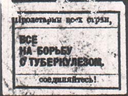 1930 1930 г. Разм. 44 х 34 мм. Одноцветная печать на бумаге различных цветов. В прямоугольной рамке разм. 37 х 27 мм в центре текст в три строки: «Все на борьбу с туберкулезом». Сверху и снизу в отдельных рамках текст: «Пролетарии всех стран, соединяйтесь!».