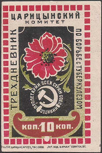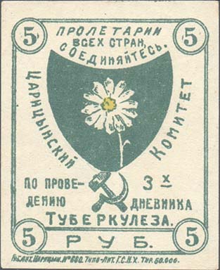 1923 1923 г. Разм. 52 х 64 мм. Двухцветная печать на белой бумаге. В центре в двойной рамке с закругленными краями щиток сложной формы с цветком ромашки. Внизу серп и молот. Сверху текст в три строки: «Пролетарии всех стран, соединяйтесь». Вокруг щитка в центре текст: «Царицынский комитет». Внизу продолжение текста: «По проведению 3-х дневника Туберкулеза». По углам номинал в круглых рамках. Внизу под рамкой мелким шрифтом выходные данные: «Губ. Лит. Царицын №660. Типо-Лит. Г.С.Н.Х. Тир. 60.000.».