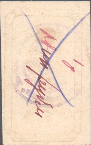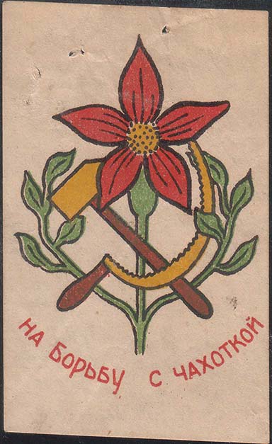 1929 1929(?) г. Разм. 38 х 62 мм. Двухцветная печать на толстой белой бумаге. В центре в двойной декоративной восьмиугольной рамке разм. 33 х 57 мм пятиконечная звезда с серпом и молотом на фоне цветка мака. С верху текст: «На борьбу». Внизу продолжение текста: «С туберкулезом». По углам разграничительные линии. На оборотной стороне фиолетовый оттиск круглой печати с неразборчивым текстом и номинал красными чернилами от руки в виде цифры и текста.