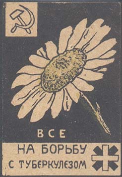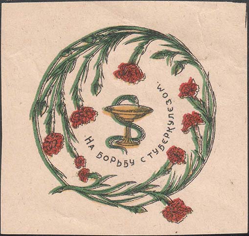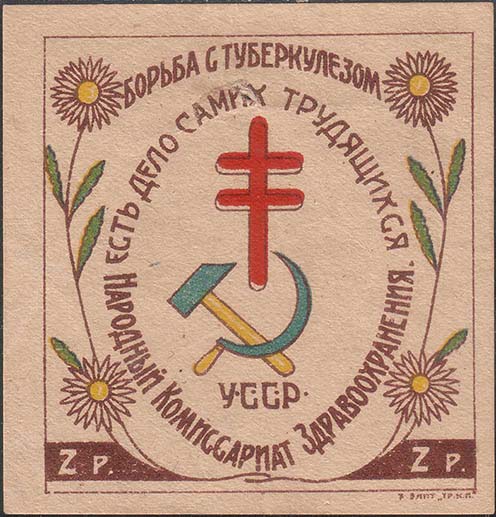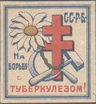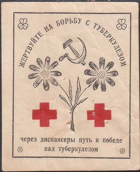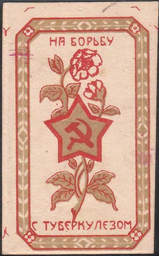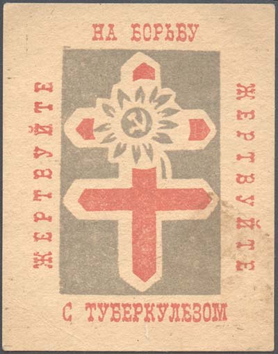 1925 1925(?) г. Разм. 66 х 84 мм. Двухцветная печать на толстой желтоватой бумаге. В центре на сплошном фоне шестиконечный крест и цветок с серпом и молотом в центре. По периметру текст: «Жертвуйте на борьбу с туберкулезом».
