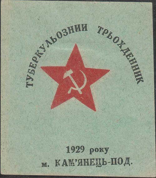 1929 1929 г. Разм. 66 х 84 мм. Двухцветная печать на зелено-серой бумаге. В центре пятиконечная звезда с серпом и молотом. Сверху полукругом текст на украинском языке: «Туберкулезный трехдневник». Внизу текст в две строки на украинском языке: «1929 год г. Каменец-Под[ольский].».