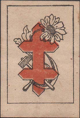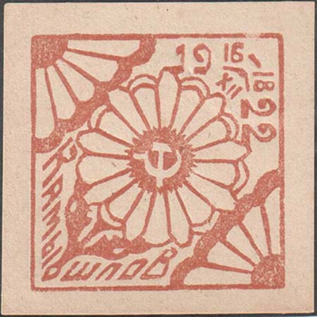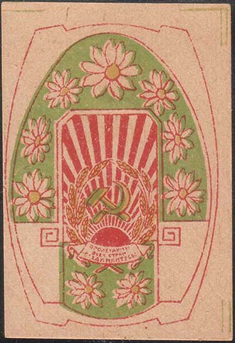 1922 1922(?) г. Разм. 35 х 51 мм. Двухцветная печать на сероватой бумаге. В прямоугольной рамке разм. 29,5 х 43 мм шестиконечный крест на фоне серпа и молота и цветка ромашки.
