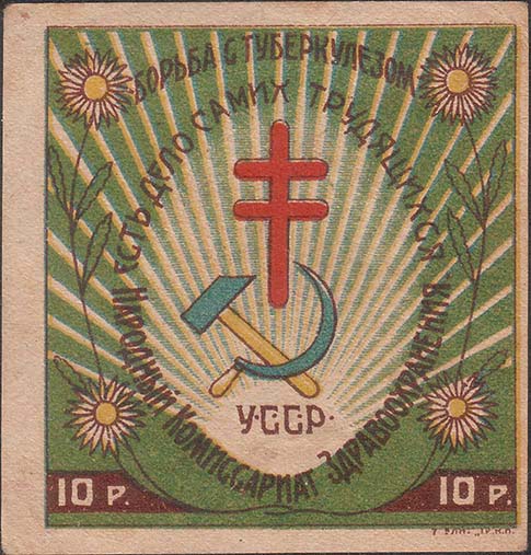 1923 1923 г. Разм. 62 х 64 мм. Многоцветная печать на желтоватой бумаге. В центре серп и молот, шестиконечный крест и аббревиатура «У.С.С.Р.» на фоне лучей восходящего солнца в обрамлении венка из цветов ромашки. Сверху полукругом текст: «Борьба с туберкулезом». В центре по овалу продолжение текста: «Есть дело самих трудящихся. Народный Комиссариат Здравоохранения». Внизу по углам номинал. В правом нижнем углу под рамкой мелким шрифтом выходные данные неразборчиво.