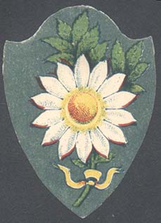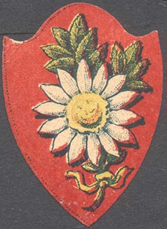 1915 1915 г. Виньетка в виде щитка сложной формы разм. 38 х 54 мм. Многоцветная печать на белой бумаге. В центре на сплошном фоне цветок ромашки с двумя листьями и стеблем, перевитым внизу лентой.