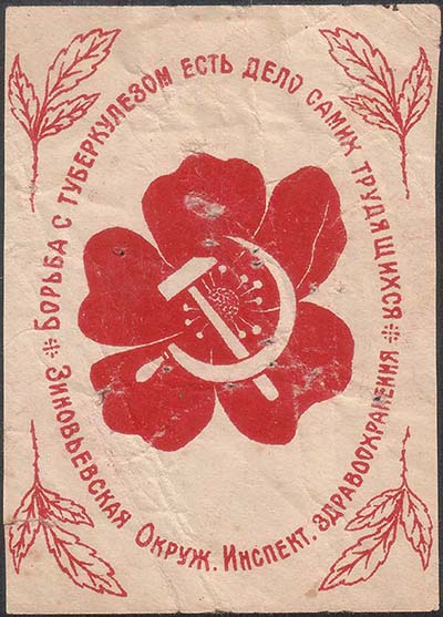 1930 1930(?) г. Разм. 53 х 70 мм. Одноцветная печать на белой бумаге. В центре цветок мака и серп и молот. По окружности текст: «Борьба с туберкулезом есть дело самих трудящихся. Зиновьевская Окруж[ная]. Инспект[ура]. здравоохранения». По углам растительный орнамент.