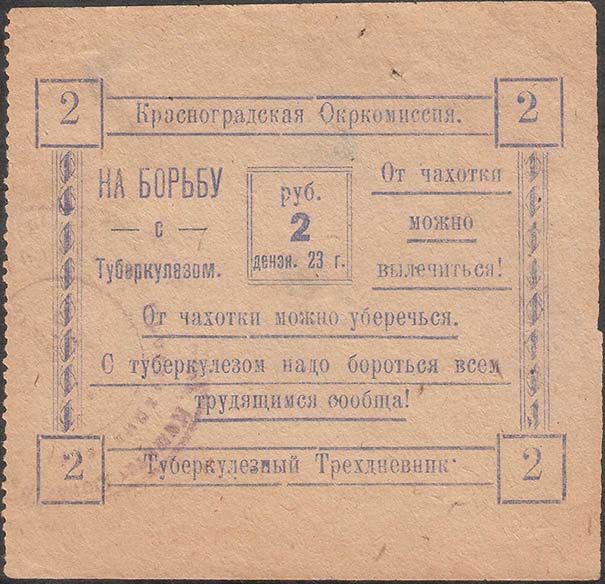 1923 1923 г. Листок из квитанционной книжки разм. 76 х 72 мм. Одноцветная печать на тонкой желтоватой бумаге. Левосторонняя зубц. 11 1/2. В двойной прямоугольной декоративной рамке с квадратами по углам в центре в прямоугольной рамке номинал в три строки: «Руб. 2 дензн. 23 г.». В квадратах по углам рамки цифры номинала. В левом верхнем углу текст в три строки: «На борьбу с туберкулезом!». В правом верхнем углу текст в три строки: «От чахотки можно вылечиться!». Внизу текст с подчеркиванием в три строки: «От чахотки можно уберечься! С туберкулезом надо бороться всем трудящимся сообща!». Сверху между рамками текст: «Красноградская Окркомиссия». Внизу между рамками текст: «Туберкулезный Трехдневник». На лицевой стороне фиолетовый оттиск круглой контрольной печати с неразборчивым текстом.