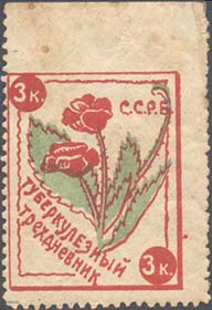 1924 1924 г. Разм. рамки 26 х 33 мм. Двухцветная печать на желтоватой бумаге. Зубц. 11/12 и Б.З. С клеем. В центре два цветка мака с листьями. В левом верхнем и в правом нижнем углу номинал. В правом верхнем углу аббревиатура «С.С.Р.Б.». В левом нижнем углу под наклоном текст в две строки: «Туберкулезный трехдневник».