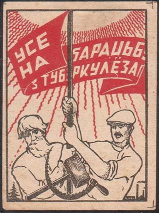 1925 1925(?) г. Разм. 52 х 69 мм. Двухцветная печать на белой бумаге. В прямоугольной рамке разм. 37,5 х 67 мм в центре рабочий и крестьянин держат флаг на фоне лучей восходящего солнца. На полотнище флага текст в три строки на белорусском языке: «Все на борьбу с туберкулезом!». Внизу скрещенные серп и молот. По углам разграничительные линии.
