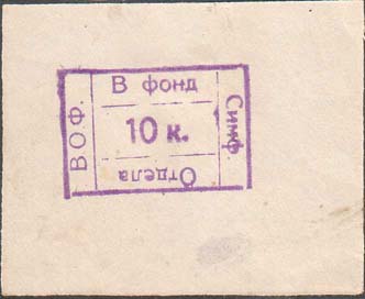 1932 1932 г. Разм. рамки 56 х 45 мм. Одноцветная печать на бумаге различных цветов. В центре фиолетовый оттиск ручного прямоугольного штампа разм. 29 х 19 мм. В центре штампа номинал. По внутреннему периметру штампа текст: «В фонд Симф[еропольского]. Отдела ВОФ».