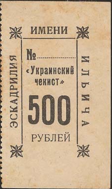 1924 1924 г. Квитанция разм. 39 х 64 мм. Одноцветная печать на светло-серой бумаге. Левосторонняя зубц. 11 1/2. В центре в прямоугольной декоративной рамке текст в три строки: «№ ... «Украинский чекист»». Внизу номинал. По наружному периметру рамки текст: «Эскадрилья имени Ильича».