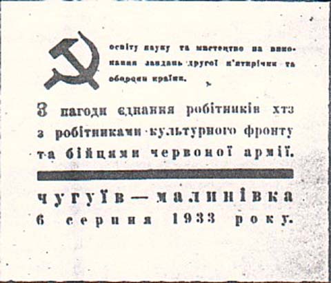 1933 1933 г. Разм. 81 х 69 мм. Одноцветная печать на белой бумаге. В центре текст в три строки на украинском языке. Сверху слева серп и молот. Правее текст в три строки на украинском языке: «Просвещение наука и мастерство на выполнения задач второй пятилетки и обороны страны». Внизу толстая горизонтальная черта и текст в две строки на украинском языке: «Чугуев – Малиновка 6 сентября 1933 года».