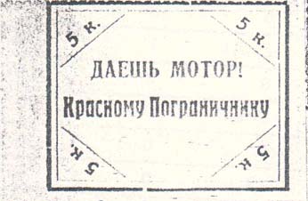1931 1931 г. Сентябрь. Разм. рамки 45,5 х 35,5 мм. Одноцветная печать на бумаге различных цветов. Зубц. 11 1/2 или просечка. В двойной прямоугольной рамке в центре текст в две строки: «Даешь мотор! Красному Пограничнику». По углам номинал, отделенный линиями.