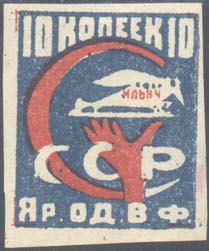 1924 1924 г. Разм. рамки 30 х 30 мм. Одноцветная печать на белой (оттенки) бумаге. В прямоугольной рамке на сплошном фоне в центре рука, держащая самолет-моноплан «Ильич». Сверху номинал. Внизу текст в две строки: «СССР. Яр. О.Д.В.Ф.».