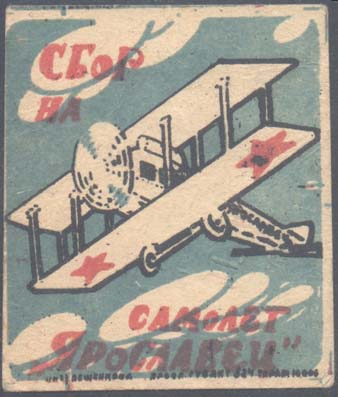 1924 1924(?) г. Разм. рис. 53 х 60,5 мм. Трехцветная печать на плотной белой бумаге. В центре самолет-биплан, летящий влево на фоне облаков. В левом верхнем углу текст в две строки: «Сбор на». Внизу продолжение текста в две строки: «Самолет «Ярославец»». Внизу под рамкой мелким шрифтом выходные данные: «Лит. Лещенкова. Яросл. Гублит 524. Тираж 10.000.». На обороте красно-фиолетовый оттиск круглой печати диаметром 36 мм. В центре печати текст в две строки: «Ярославский Губ[ернский]. Отдел.». По окружности текст: «Всероссийский Союз Работников Коммунального Хозяйства».