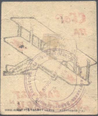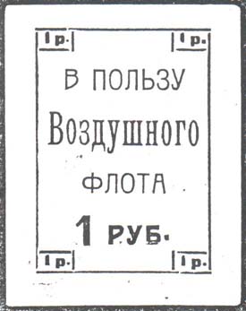 1923 1923 г. Разм. рамки 38 х 46. Одноцветная печать на серо-голубой бумаге. Текст в три строки: «В пользу Воздушного Флота». По внутренним углам рамки и внизу номинал.