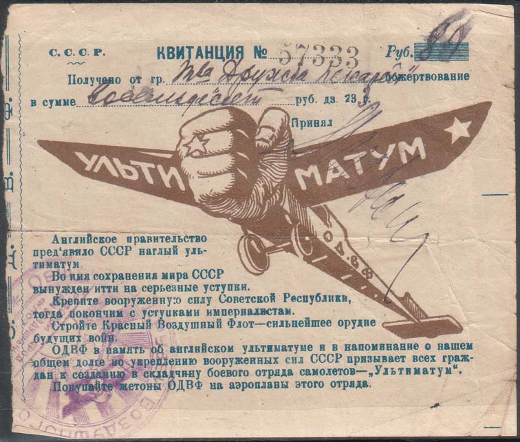 1923 1923 г. Квитанция разм. 125 х 106 мм. Двухцветная печать на белой бумаге. В центре аллегорический рисунок: самолет с тексом «Ультиматум» на крыльях и аббревиатурой «О.Д.В.Ф» на фюзеляже. Носовая часть самолета в виде сжатого кулака. Сверху текст в четыре строки: «С.С.С.Р. Квитанция №... Руб. ... Получено от гр. ... пожертвование в сумме... руб. дз. 23 г. Принял ...». Внизу текст в тринадцать строк: «Английское правительство предъявило СССР наглый ультиматум. Во имя сохранения мира СССР вынужден идти на серьезные уступки. Крепите вооруженную силу Советской Республики, тогда покончим с уступками империалистам. Стройте Красный Воздушный Флот – сильное орудие будущих войн. ОДВФ в память об английском ультиматуме и в напоминание о нашем общем долге по укреплению вооруженных сил СССР призывает всех граждан к созданию в складчину боевого отряда самолетов – «Ультиматум». Покупайте жетоны ОДВФ на аэропланы этого отряда». Слева вертикально волнистая полоса, обозначающая линию отрыва. Левее вертикально аббревиатура «ОДВФ». На лицевой стороне фиолетовый оттиск круглой контрольной печати ОДВФ СССР.