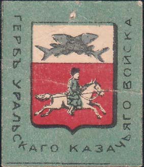 1915 1915(?) г. Разм. 35 х 41 мм. Многоцветная печать на плотной белой бумаге. На сплошном фоне в центре герб Уральского казачьего войска. По периметру текст: «Герб Уральского казачьего войска».
