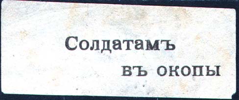 1915 1915(?) г. Разм. 82 х 32 мм. Одноцветная печать на сероватой бумаге. В центре текст в две строки: «Солдатам в окопы».