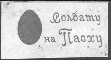 1915 1915(?) г. Разм. 59 х 30 мм. Одноцветная печать на толстой желтоватой бумаге. Слева пасхальное яйцо, справа текст в две строки: «Солдату на Пасху».