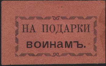 1915 1915 г. Разм. 57 х 35 мм. Одноцветная печать светло-розовой бумаге. В прямоугольной декоративной рамке разм. 45 х 22 мм. Текст в две строки: «На подарки воинам».