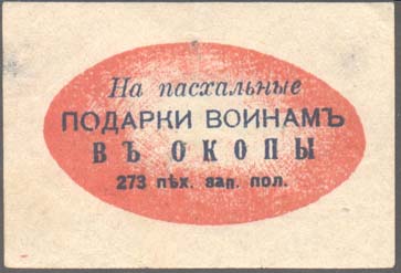 1915 1915(?) г. Разм. 60 х 40 мм. Двухцветная печать на тонкой кремовой бумаге. В центре горизонтально пасхальное яйцо, на котором текст в четыре строки: «На пасхальные подарки воинам в окопы 273 пех[отный]. зап[асной]. пол[к].».