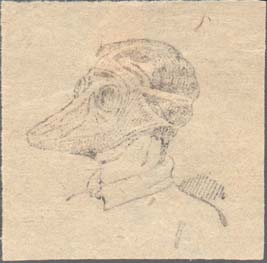 1915 1915(?) г. Разм. 44 х 44 мм. Одноцветная печать на серо-желтой бумаге. В центре человек в противогазной маске.