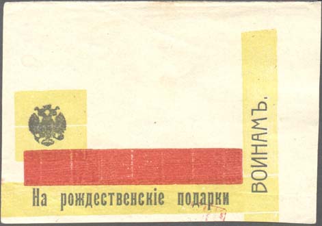 1915 1915(?) г. Разм. 78 х 55 мм. Трехцветная печать на белой бумаге. Слева на сплошном фоне герб России. Внизу и слева вертикально текст: «На рождественские подарки воинам».