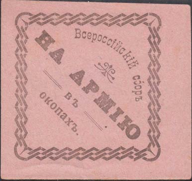 1915 1915(?) г. Ромб разм. 88 х 88 мм. Одноцветная печать на серо-розоватой бумаге. В центре в декоративной рамке в форме ромба текст в четыре строки: «Всероссийский сбор на армию в окопах».