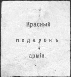 1917 1917(?) г. 19.10.1917 г. Разм. 47 х 51 мм. Одноцветная печать на желтоватой бумаге. В центре текст в три строки: «Красный подарок армии».