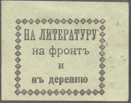 1917 1917(?) г. Разм. 45 х 35 мм. Одноцветная печать на светло-зеленой бумаге. В центре в прямоугольной рамке из ромбиков разм. 32 х 27 мм текст в четыре строки: «На литературу на фронт и в деревню».