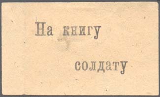 1917 1917(?) г. Разм. 54 х 32 мм. Одноцветная печать на тонкой желтоватой бумаге. В центре текст в две строки: «На книгу солдату».