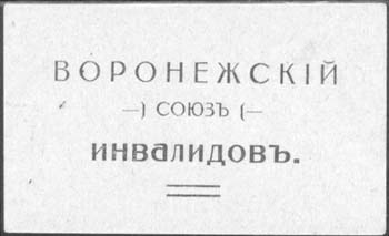 1917 1917 г. Разм. 62 х 38 мм. Одноцветная печать на бумаге разных цветов. В центре текст в три строки: «Воронежский союз инвалидов». Внизу декоративный элемент в виде двух горизонтальных штрихов.