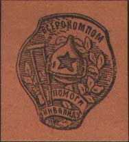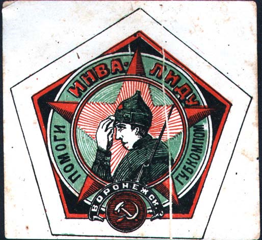 1923 1923(?) г. Разм. 85 х 80 мм. Трехцветная печать на белой бумаге. В двойной пятиугольной рамке в центре дополнительная двойная круглая рамка. В круг-лой рамке в центре раненый красноармеец на фоне пятиконечной звезды. По окружности между круглыми рамками текст: «Помоги инвалиду. Воронежск[ий]. ГУБКОМПОМ». Внизу в тройной круглой рамке серп и молот.