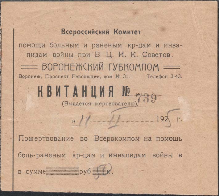 1925 1925 г. 11.02.1925 г. Листок из квитанционной книжки разм. 121 х 105 мм. Одноцветная печать на сероватой бумаге. Левосторонняя нерегулярная зубц. В центре текст в одиннадцать строк: «Всероссийский Комитет помощи больным и раненым кр[асноармей]-цам и инвалидам войны при В.Ц.И.К. Советов. Воронежский Губкомпом Воронеж, Проспект Революции, дом № 31. Телефон 3-34. Квитанция № ... (Выдается жертвователю). «...»...192... г. Пожертвование во Всерокомпом на помощь боль[ным]-раненым кр[асноармей]-цам и инвалидам войны в сумме ... руб ... к. Слева вертикальная линия. На оборотной стороне каучуковым штампом нанесены юбилейные надпечатки ВСЕРОКОМПОМа.