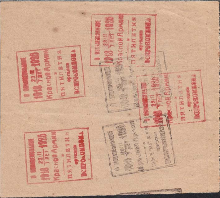 1923 1923 г. Разм. 31 х 35 мм. Одноцветная печать на серо-оранжевой бумаге. В центре значок ВСЕРОКОМПОМа.