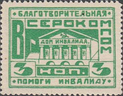 1925 1925(?) г. Разм. рамки 36 х 27,5 мм. Двухцветная двухсторонняя печать на белой (оттенки) бумаге. Зубц. 11 1/2 низкого качества. С клеем. В прямоугольной рамке в центре изображение здания с текстом на фасаде: «Дом инвалида». По внутреннему периметру рамки текст: «Благотворительная. ВСЕРОКОМПОМ ... коп. ... Помоги инвалиду». На оборотной стороне текст в три строки: «Принудительное распространение воспрещается».