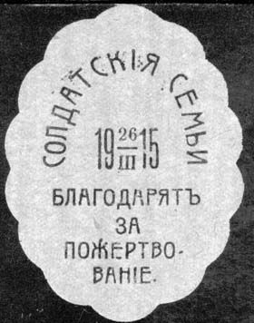 1915 1915 г. 26.03.1915 г. Виньетка овальной формы разм. ≈ 44 х 58 мм с волнистыми краями. Одноцветная печать на бу-маге различных цветов с лаковым покрытием на лицевой стороне. В центре дата: «26/III 1915». Сверху полукругом текст: «Солдатские семьи». Внизу продолжение текста в четыре строки: «Благодарят за пожертвование».