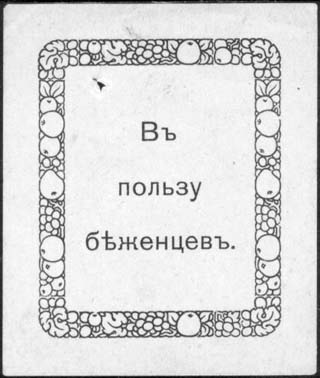 1915 1915(?) г. Разм. 52 х 62 мм. Одноцветная печать на сероватой бумаге. В двойной декоративной рамке разм. ≈ 40,5 х 44,5 мм с растительным орна-ментом текст в три строки: «В пользу беженцев».