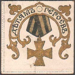 1915 1915(?) г. Разм. 41 х 41 мм. Двухцветная печать на плотной белой бумаге. В центре Георгиевский крест на колодке. Сверху в декоративной рамке с орнаментом полукругом текст: «Детям героев».