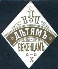 1916 1916 г. 04.-05.10.1916 г. Ромб разм. 32 х 39 мм. Одноцветная печать на толстой белой бумаге. Сверху аббревиатура: «В.О.П.П.». Ниже текст: «Детям беженцам 4.-5. Х».