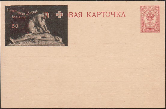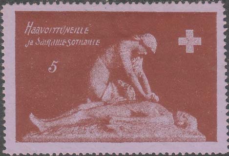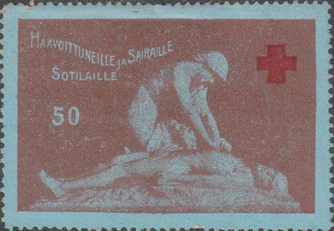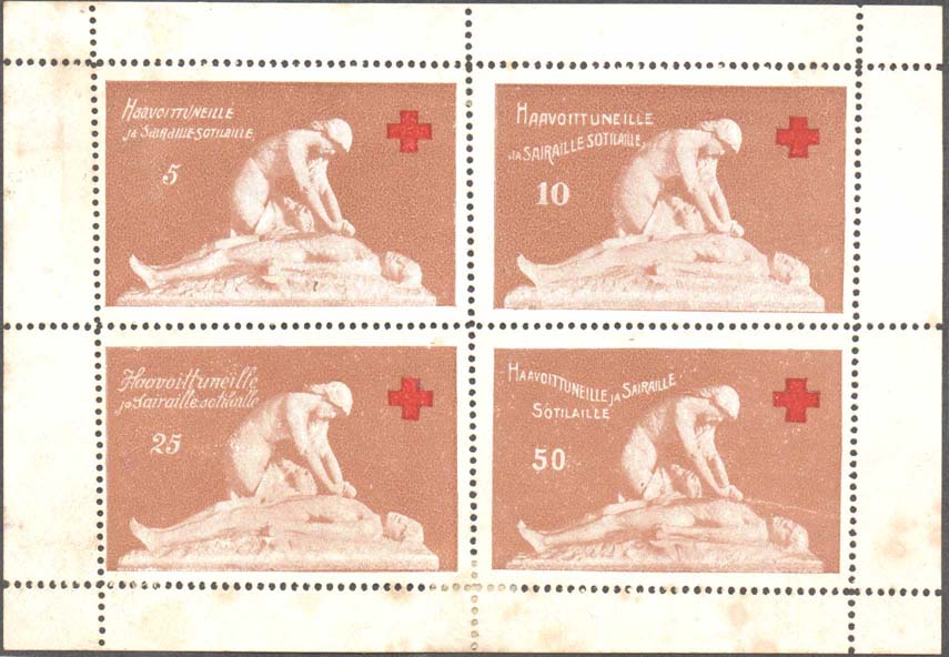 1916 1916 г. Разм. 54 х 34 мм. Двухцветная печать на плотной желтоватой бумаге со сплошным цветным фоном различных цветов. Зубц. 11 1/2. В центре аллегорический сюжет. В правом верхнем углу красный крест. Слева сверху текст в две строки на финском языке: «В пользу больных и раненых воинов» и номинал.