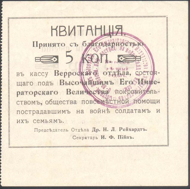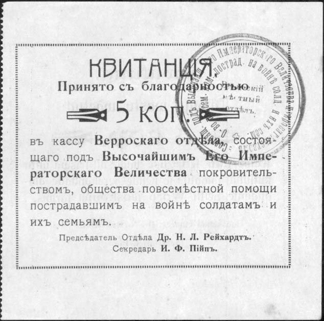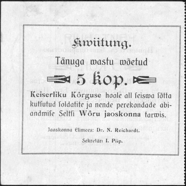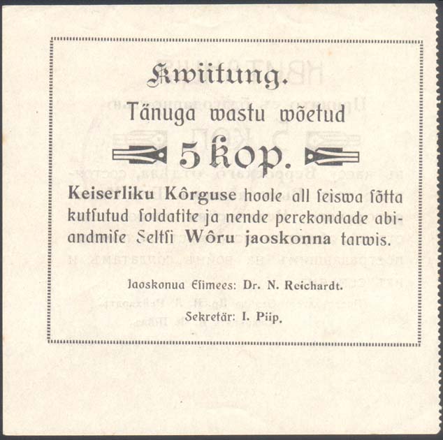 1914 1914(?) г. Листок из квитанционной книжки. Одноцветная двухсторонняя печать на тонкой белой бумаге. Левосторонняя зубц. 11 1/2. На лицевой стороне в прямоугольной рамке разм. 90 х 74 мм в центре текст в девять строк: «Квитанция. Принято с благодарностью ... коп. в кассу Верроского отдела, состоящего под Его Императорского Величества покровительством, общества повсеместной помощи пострадавшим на войне солдатам и их семьям. Председатель Отдела Др. Н.Л.Рейхардт. Секретарь И.Ф.Пийп.». На оборотной стороне тот же текст на эстонском языке. На лицевой стороне лиловый оттиск круглой контрольной печати отдела.