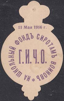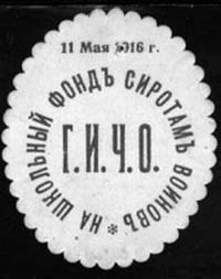 1916 1916 г. 11.05.1916 г. Виньетка в форме овала разм. 34 х 42 мм с фигурными краями. Одноцветная печать на толстой белой бумаге. В центре аббревиатура «Г.И.Ч.О.». По окружности текст: «На школьный фонд сиротам воинов». Сверху дата: «11 мая 1916 г.».