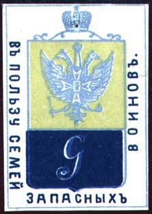 1915 1915 г. 23.04.1915 г. Разм. рамки 34 х 50 мм. Трехцветная печать на толстой белой бумаге. В прямоугольной рамке в центре герб г. Гатчины. По периметру текст: «В пользу семей запасных воинов».