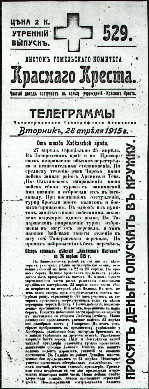 1915 1915 г. 28.04.1915 г. Листок разм. 179 х 444 мм. Двухцветная двухсторонняя печать на тонкой сероватой бумаге. На лицевой стороне текст в девять строк: «Цена 2 к. Утренний выпуск. 529. Листок Гомельского Комитета Красного Креста. ТЕЛЕГРАММЫ Петроградского Телеграфного Агентства. Вторник, 28 апреля 1915 г.». Далее текст сообщения на обеих сторонах листка. Справа снизу верх крупным шрифтом текст: «Просят деньги опускать в кружку».