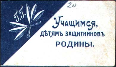 1916 1916(?) г. Разм. 65 х 37 мм. Одноцветная печать на белой бумаге. Слева на сплошном фоне кокарда гимназиста и аббревиатура «Г.Г.». Справа текст в три строки: «Учащимся, детям защитников Родины».