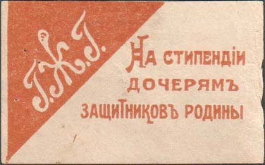 1916 1916(?) г. Разм. 40 х 60 мм. Одноцветная печать на белой бумаге. В левом верхнем углу на сплошном фоне аббревиатура «Г.Ж.Г.». Справа текст в три строки: «На стипендии дочерям защитников родины».