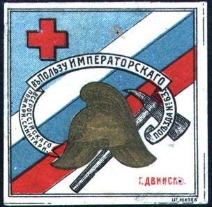 1915 1915(?) г. Разм. рамки 46 х 45 мм. Многоцветная печать на белой бумаге. В двойной прямоугольной рамке в центре на фоне диагональной ленты цветов российского флага каска пожарного и топорик. По окружности на ленте текст: «В пользу Императорского Всероссийского Пожарн[ого]. Санитарн[ого]. Поезда №63». В левом верхнем углу красный крест. В левом нижнем углу текст: «г. Двинск». Под рамкой слева внизу выходные данные мелким латинским шрифтом: «Lit. Record».