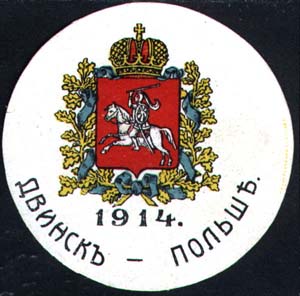 1914 1914 г. Круг диаметром 48 мм. Многоцветная печать на желтоватой бумаге с мелованным верхним слоем. В центре герб Витебской губернии, ниже дата: «1914.». Внизу полукругом текст: «Двинск - Польше».