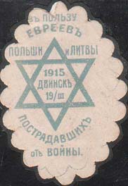 1915 1915 г. 19.03.1915 г. Виньетка в форме овала разм. 31 х 44 мм с фи-гурными краями. Одноцветная печать на белой бумаге. В центре шестиконечная звезда, в центре которой текст в три строки: «1915 Двинск 19/III». Сверху текст в три строки: «В пользу евреев Польши и Литвы». Внизу продолжение текста в две строки: «Пострадавших от войны».